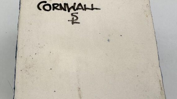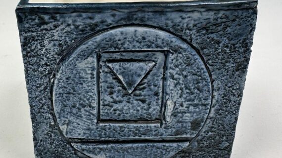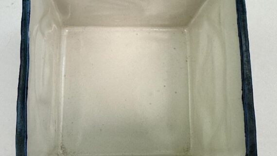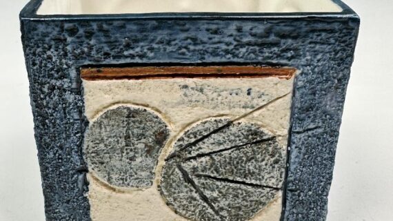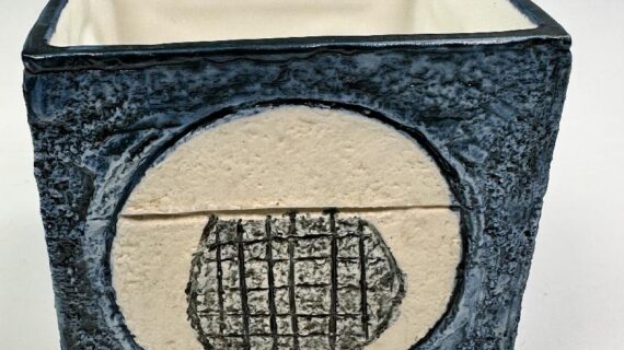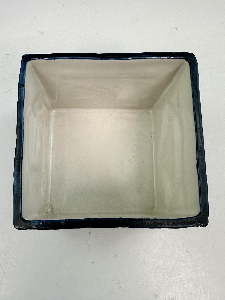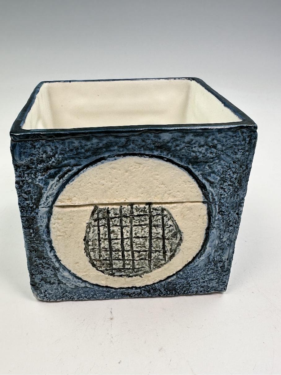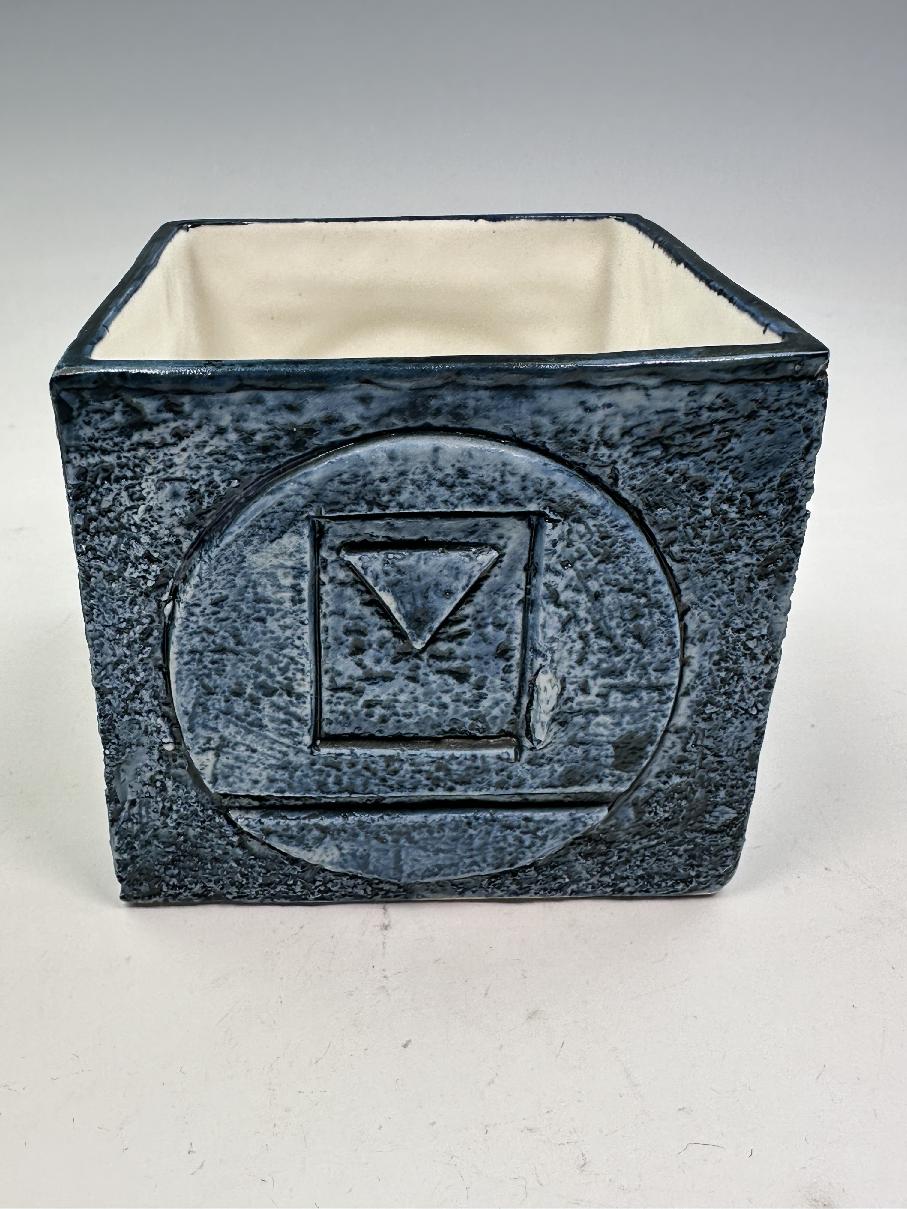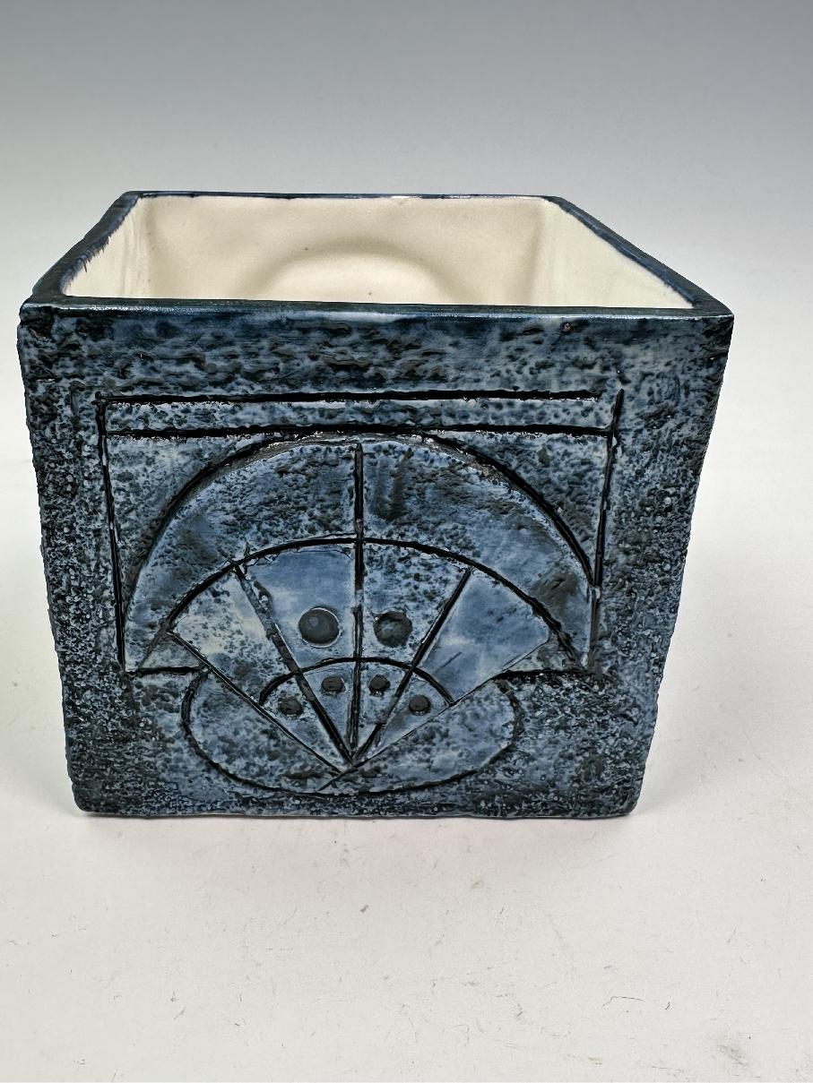 Troika Pottery cube vase in blue, with abstract patterns, decorated by Sue Lowe (SL).