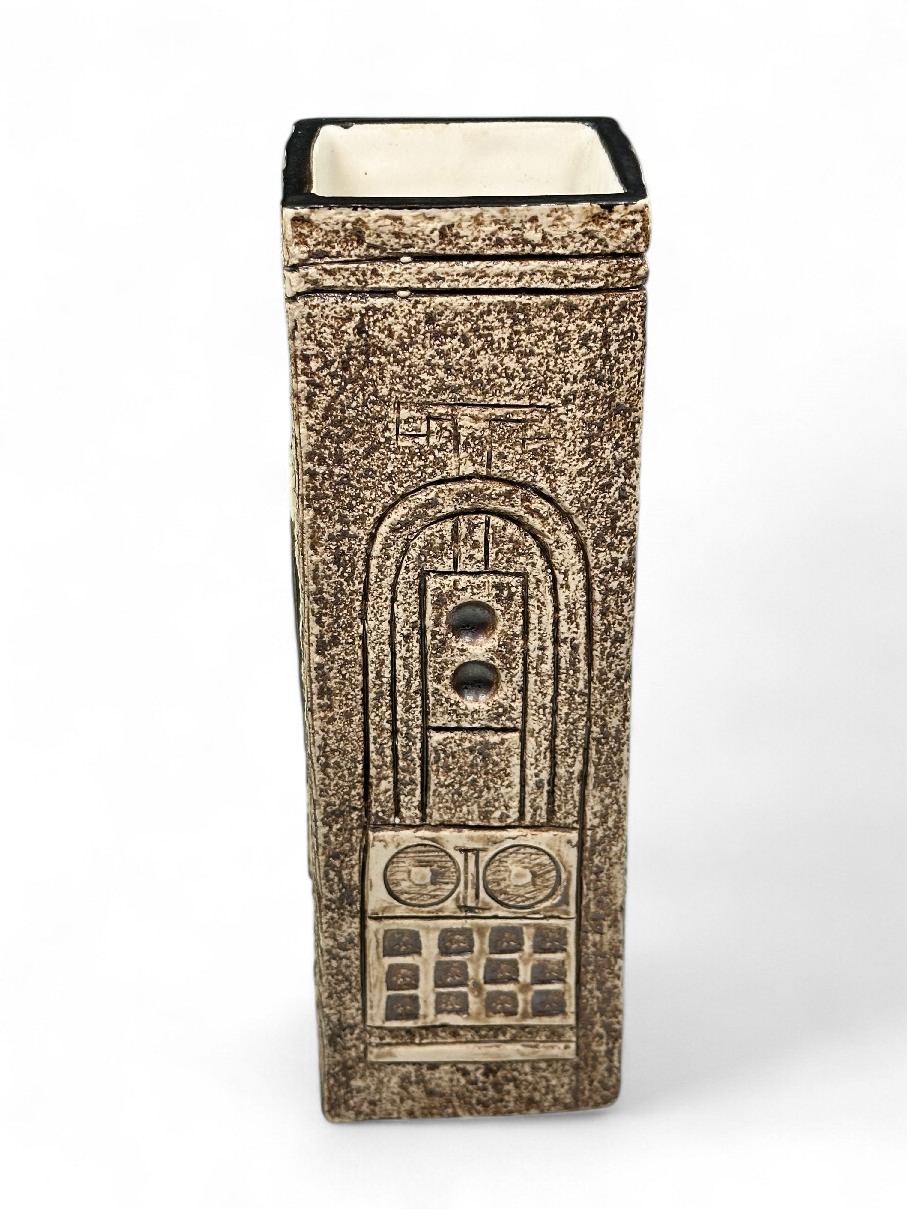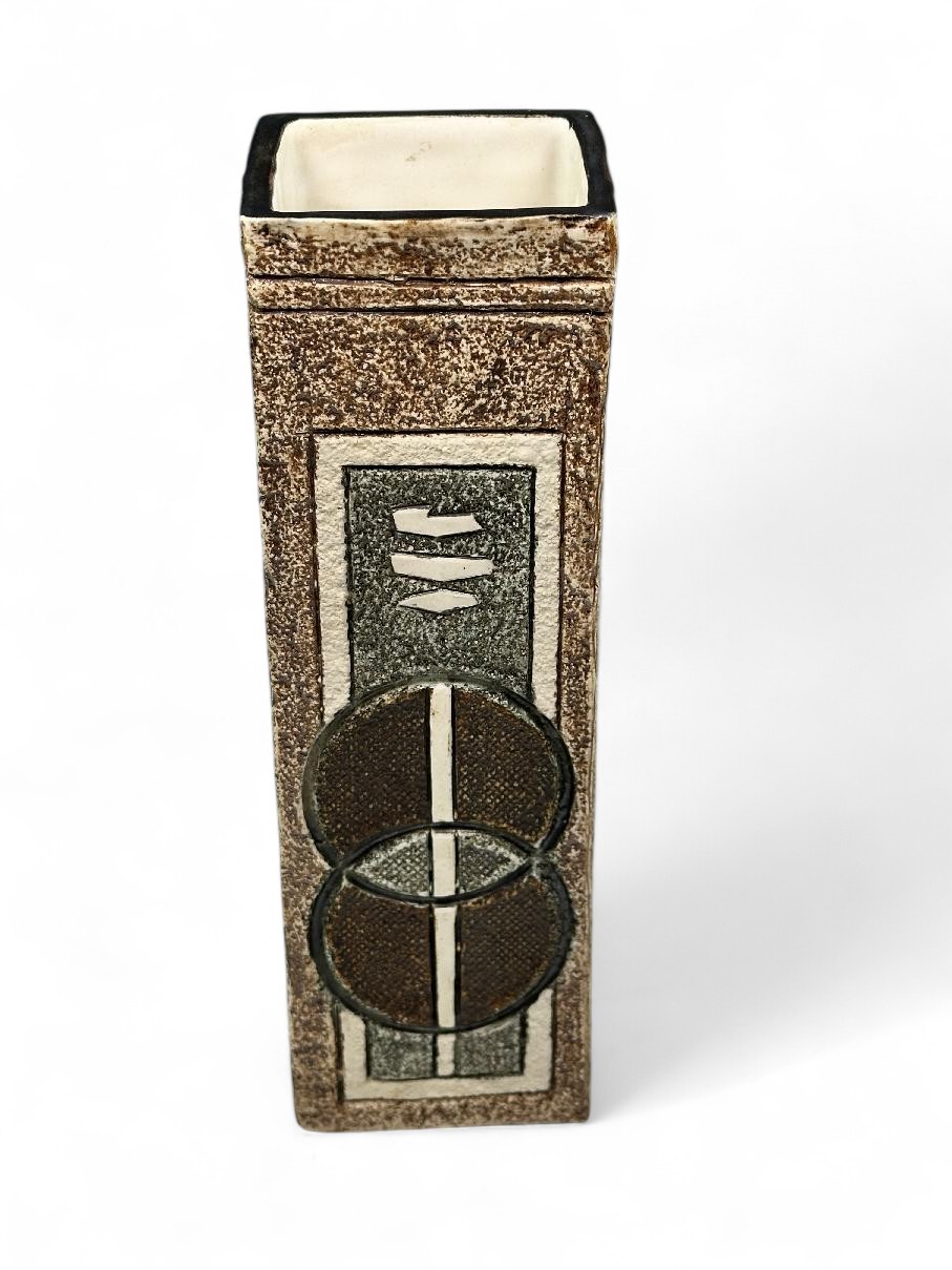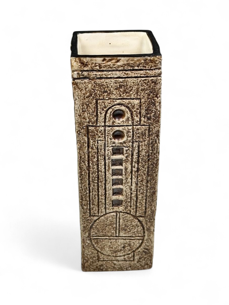 TROIKA tall square vase with abstract designs, decorated by Alison Brigden.