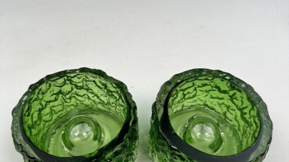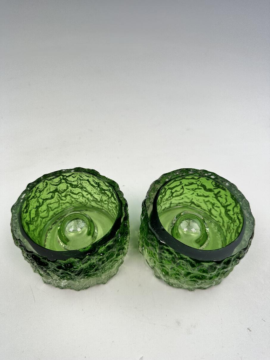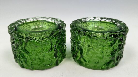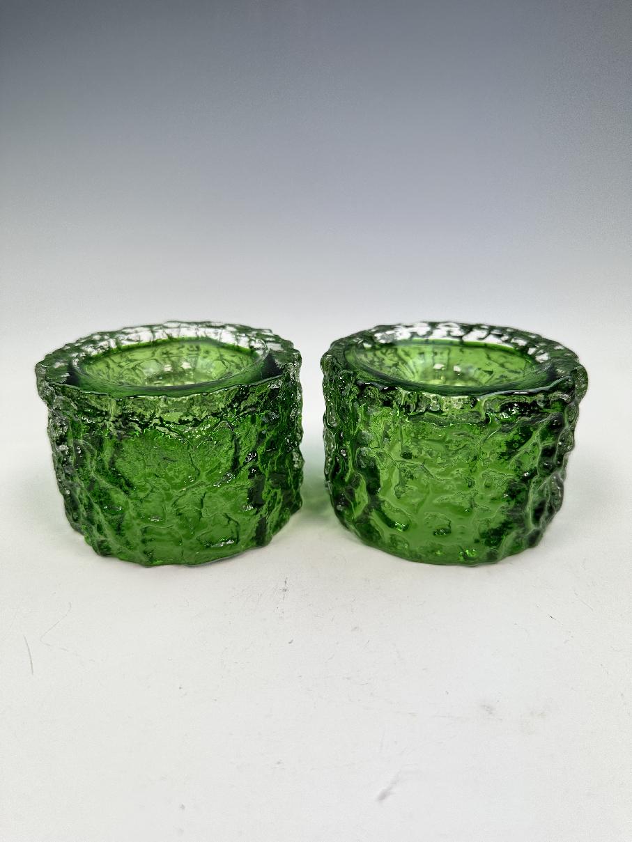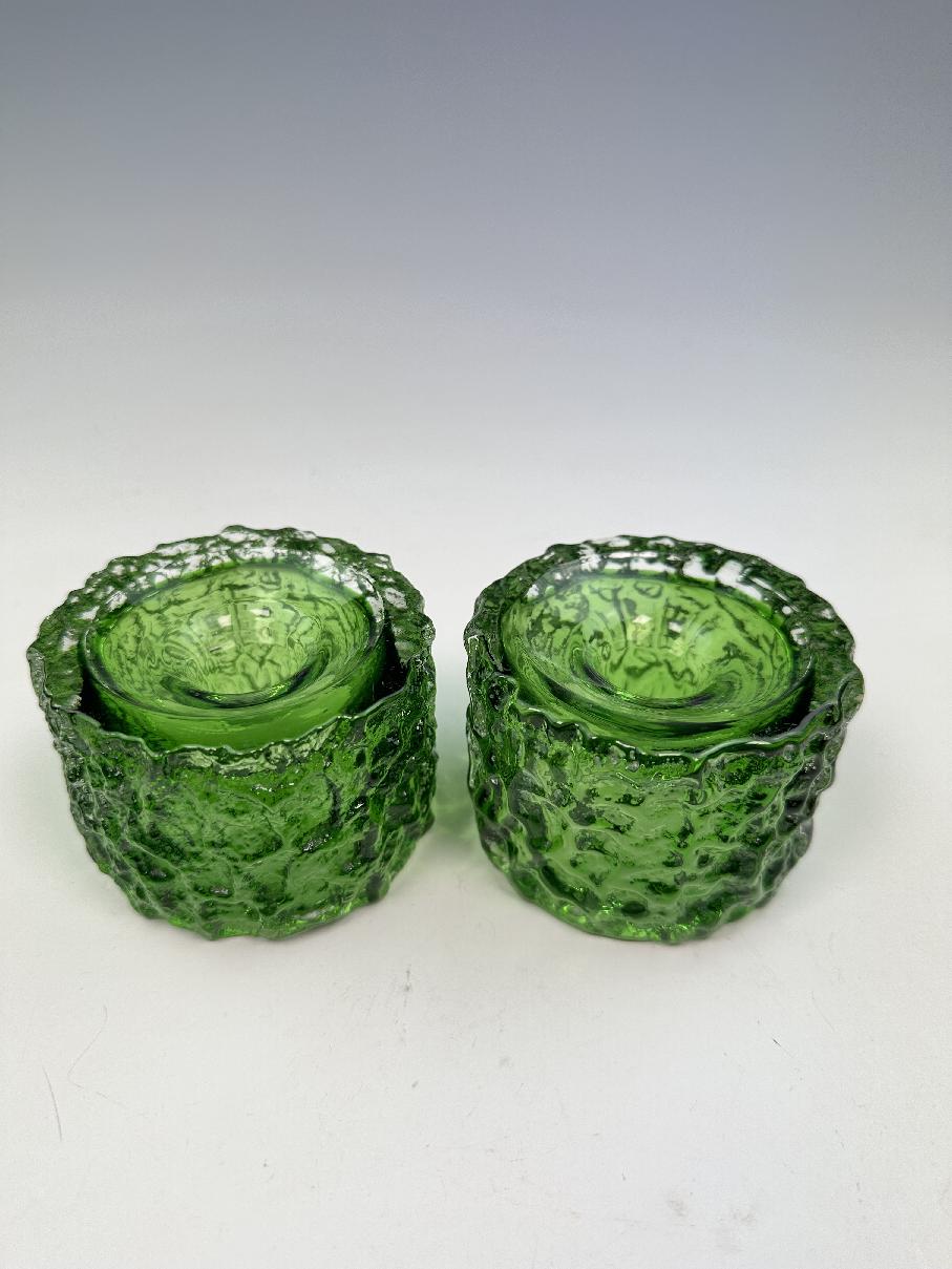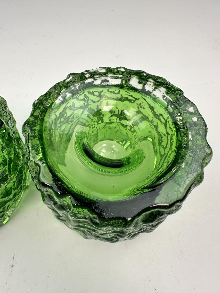 Whitefriars – A pair of Meadow Green bark effect candlesticks by Geoffrey Baxter. 6cm tall, 8cm diameter.