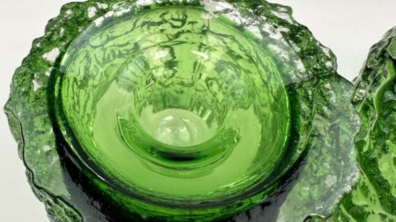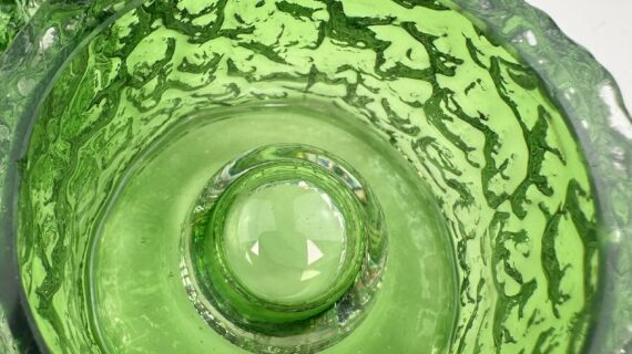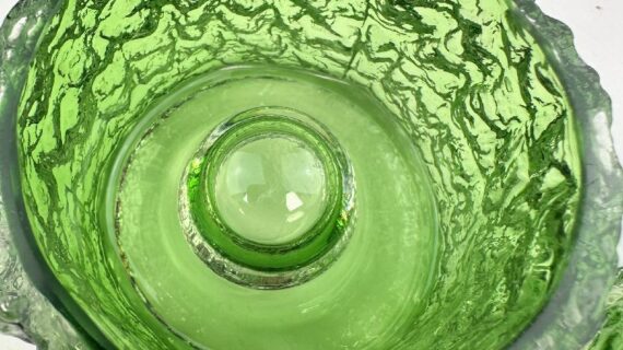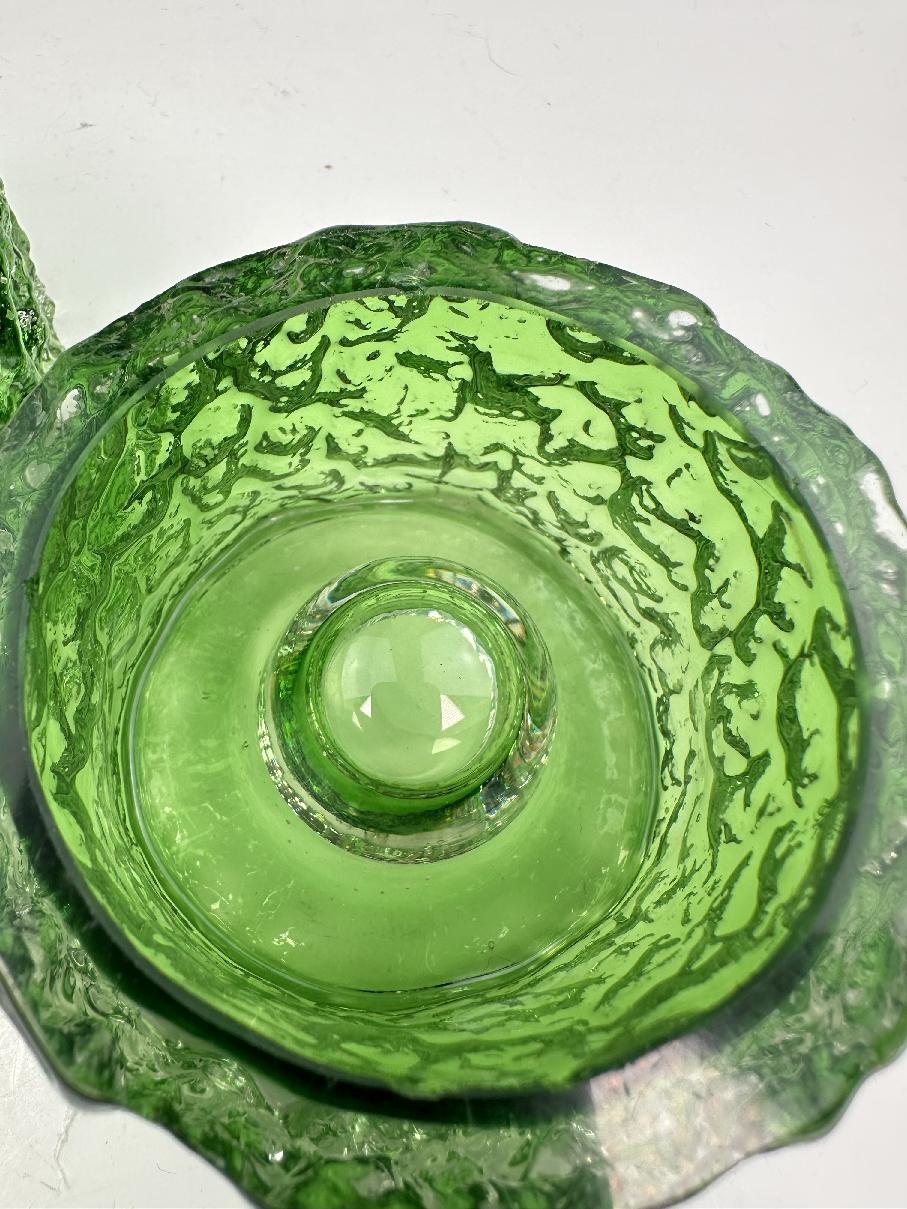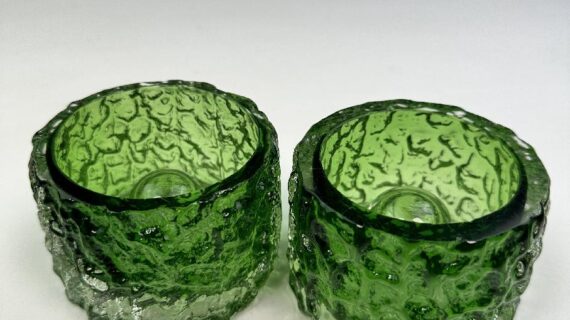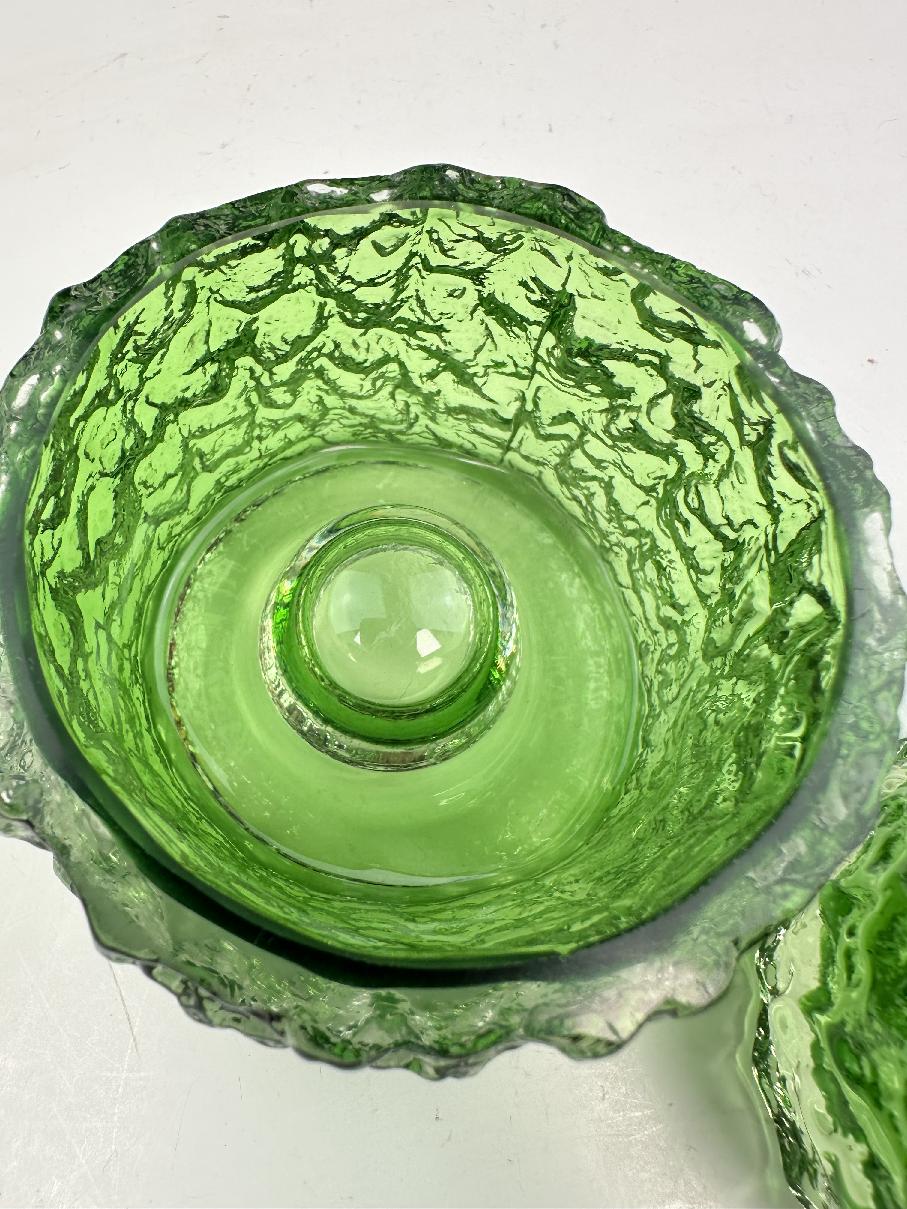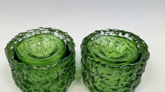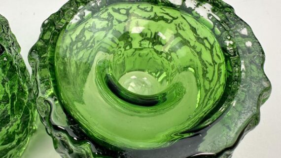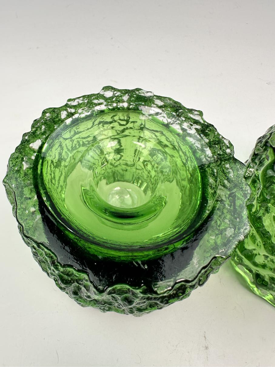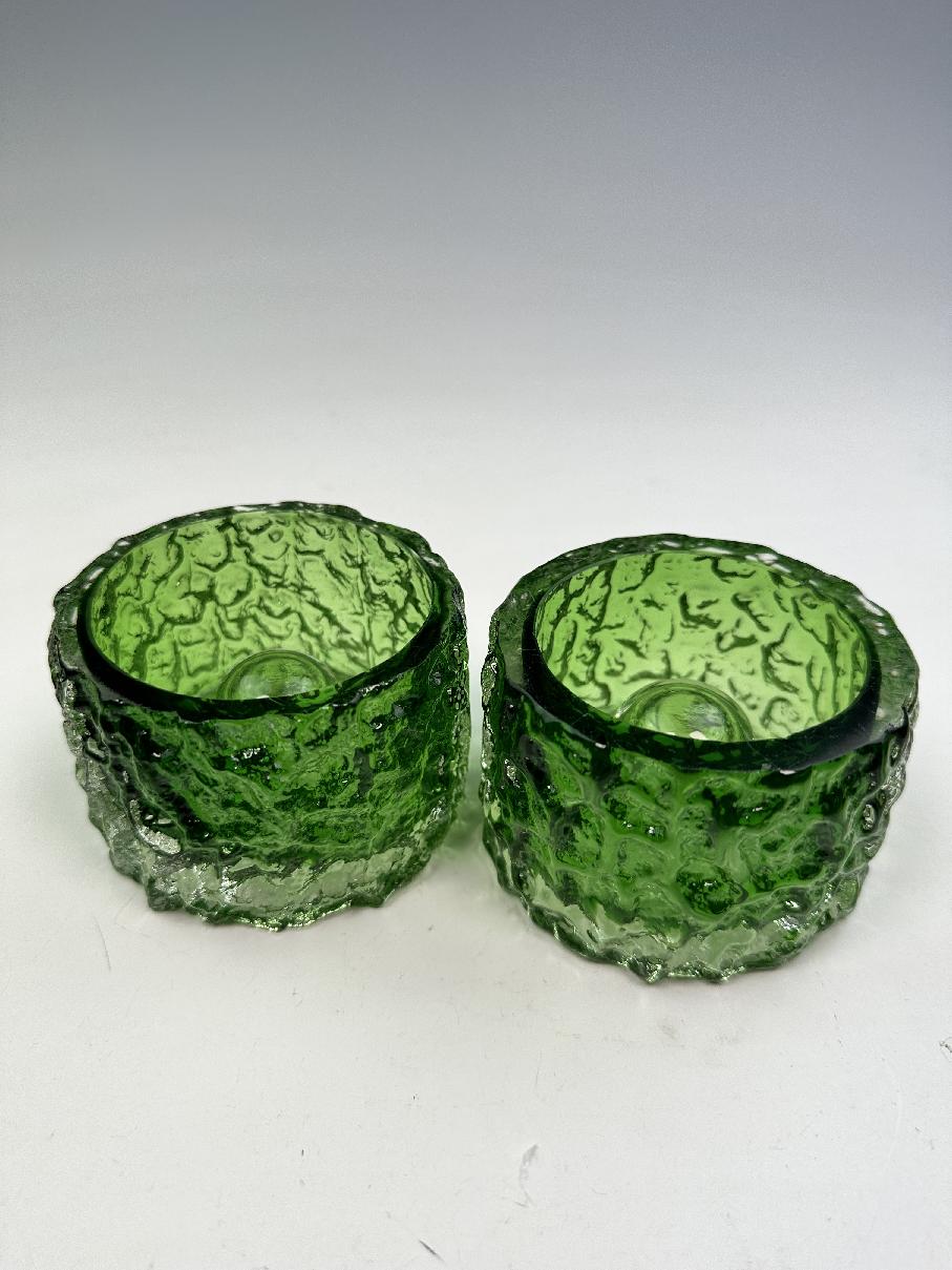 Whitefriars – A pair of Meadow Green bark effect candlesticks by Geoffrey Baxter. 6cm tall, 8cm diameter.