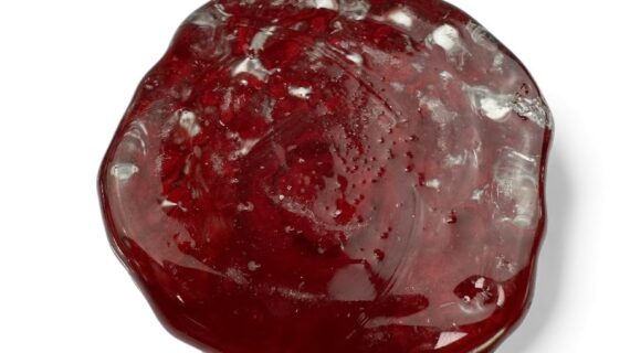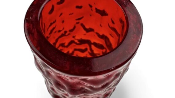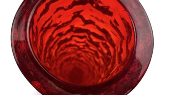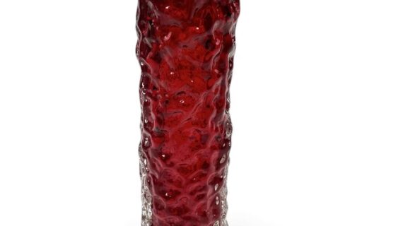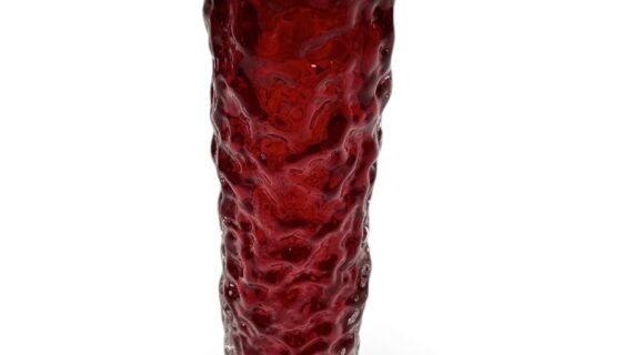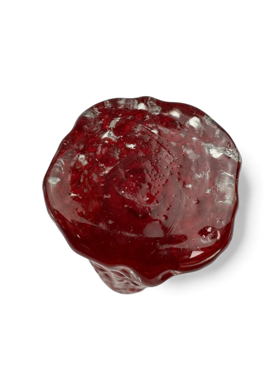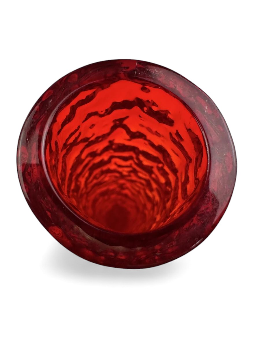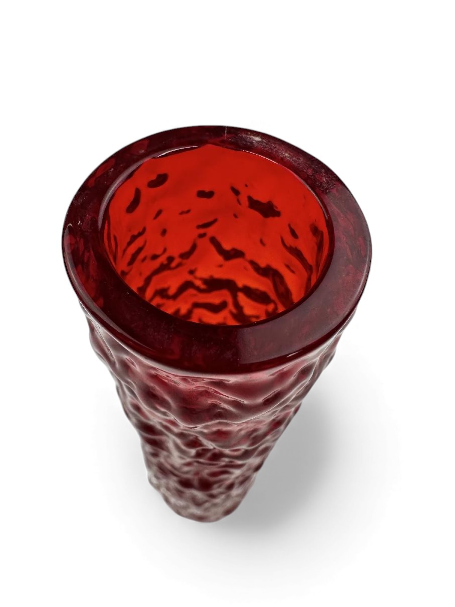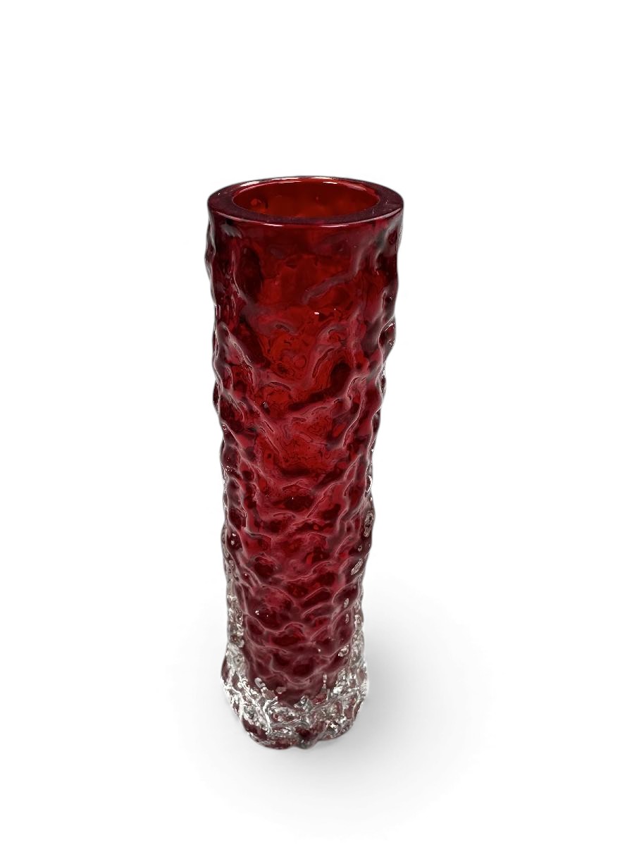 WHITEFRIARS ruby red bark pattern finger vase by Geoffrey Baxter.